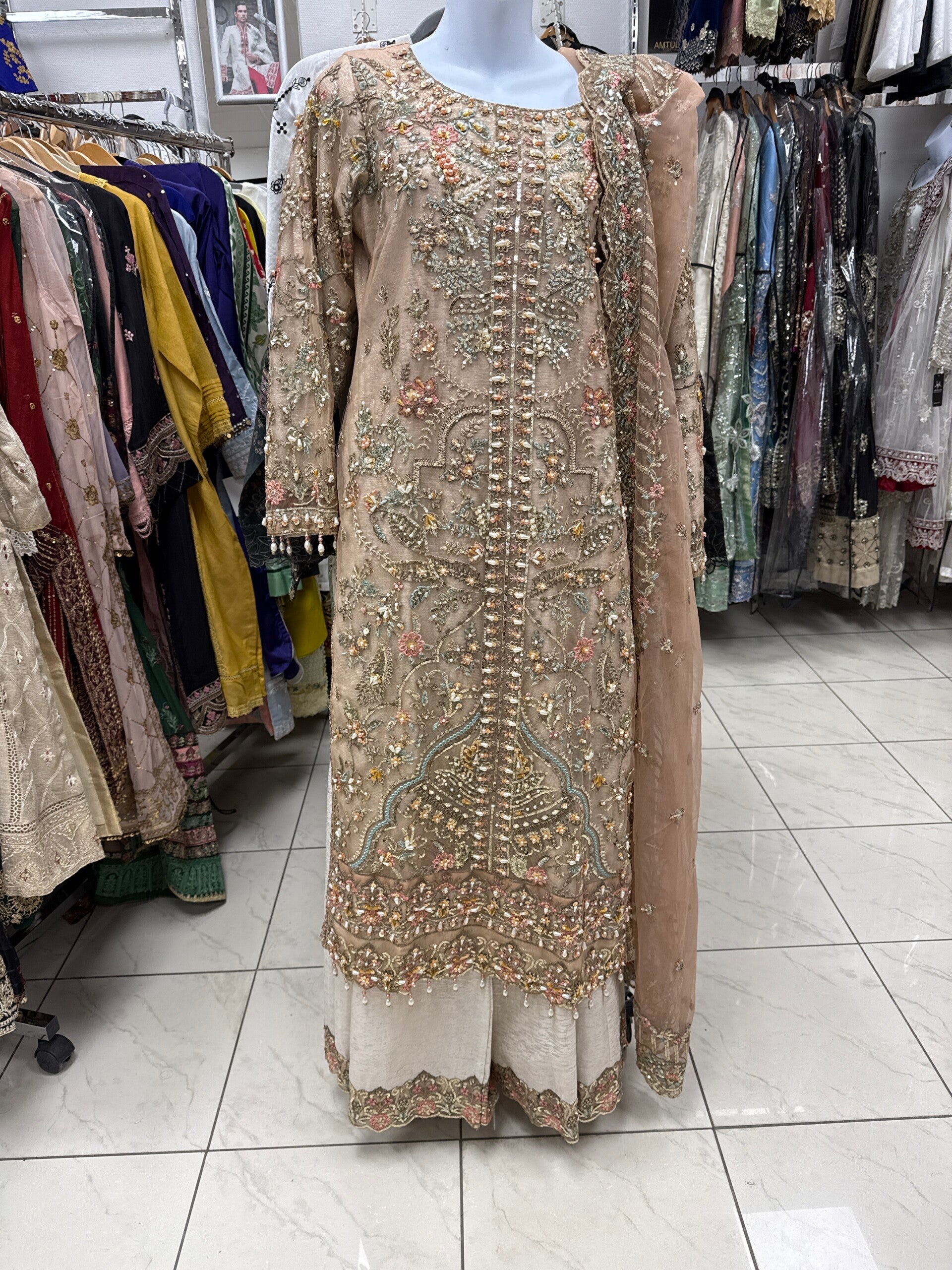 An elegant champagne-toned dress with intricate embroidery and a delicate sheer dupatta. Sophisticated and perfect for weddings, Eid, and festive occasions.