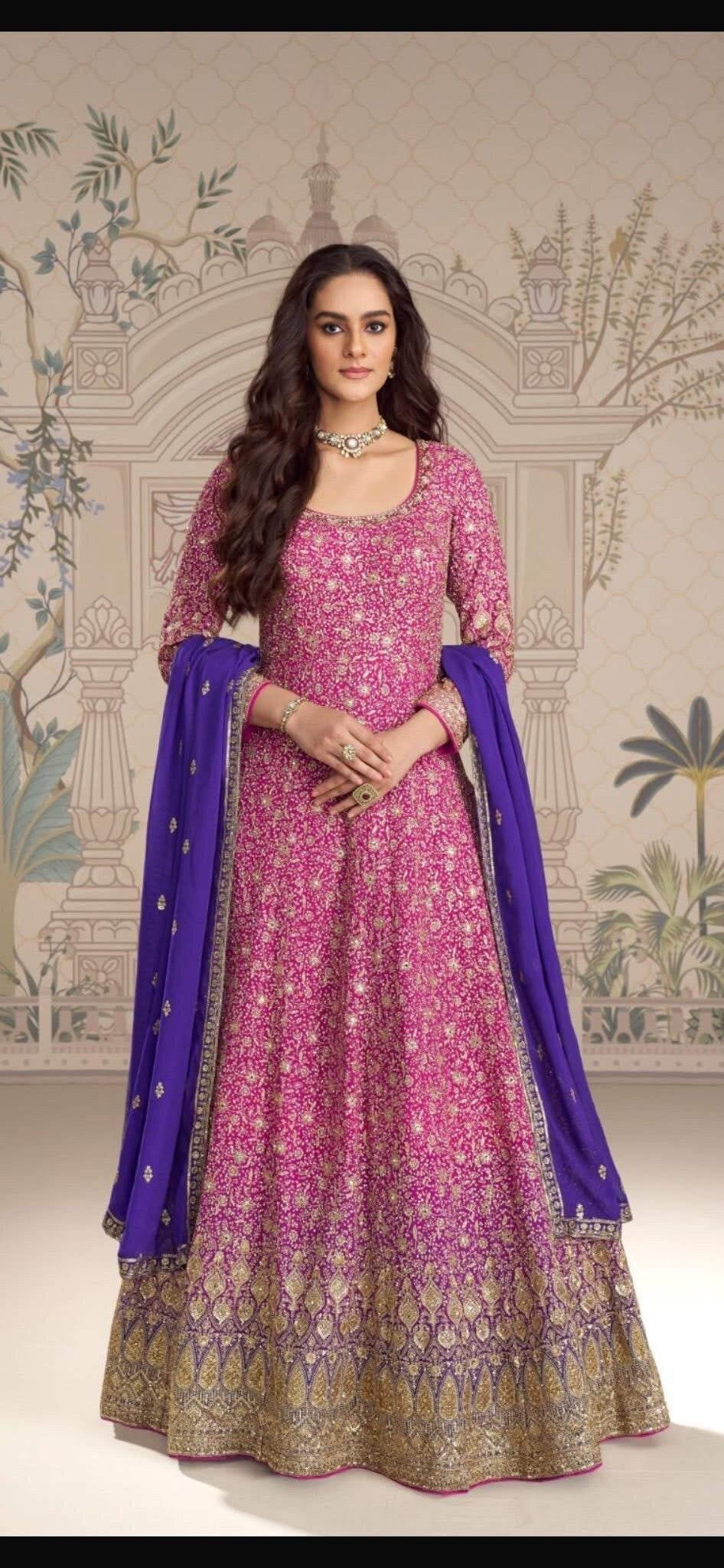 Pink embellished Anarkali with gold detailing and contrasting purple dupatta. Elegant, flowy, and perfect for weddings and festive occasions.