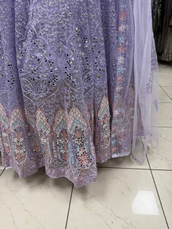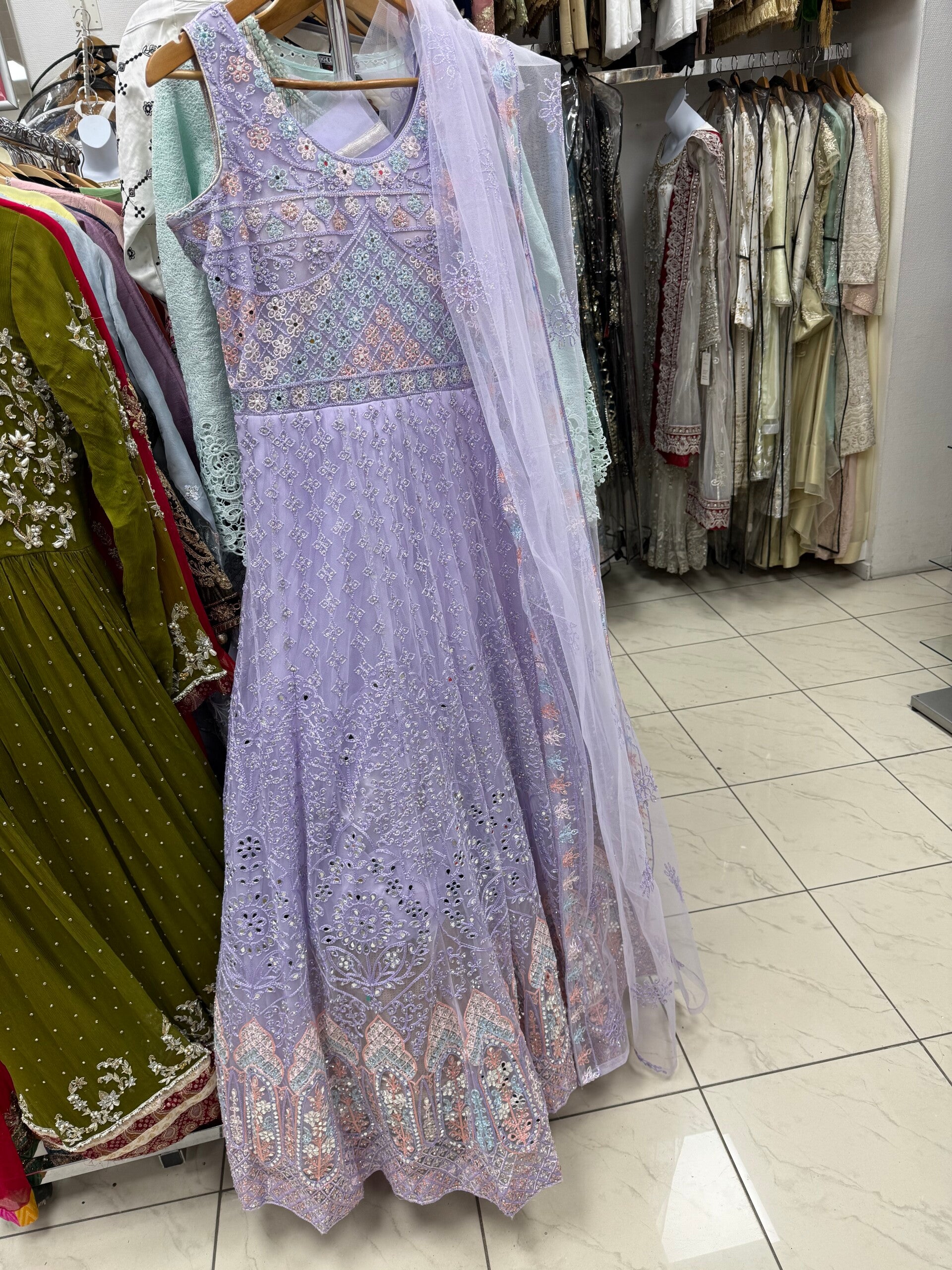 Elegant lavender sleeveless Anarkali with intricate pastel embroidery, styled in a serene, feminine look by the Little Mermaid in Copenhagen.