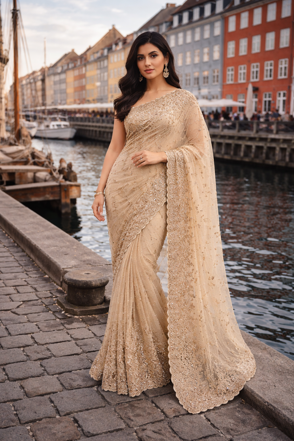 A timeless ivory saree featuring intricate hand embroidery with delicate stone and thread work, designed for a luxurious and graceful look. Perfect for weddings, festive occasions, and special events.